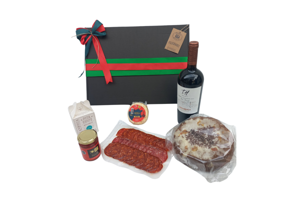 Invite a sus colaboradores a disfrutar de un auténtico festín navideño con esta generosa selección gastronómica. Un vino Gran Reserva de carácter acompaña una variada tabla de embutidos artesanales, aceitunas selectas y confitura gourmet, coronado por el clásico pan de pascua premium.