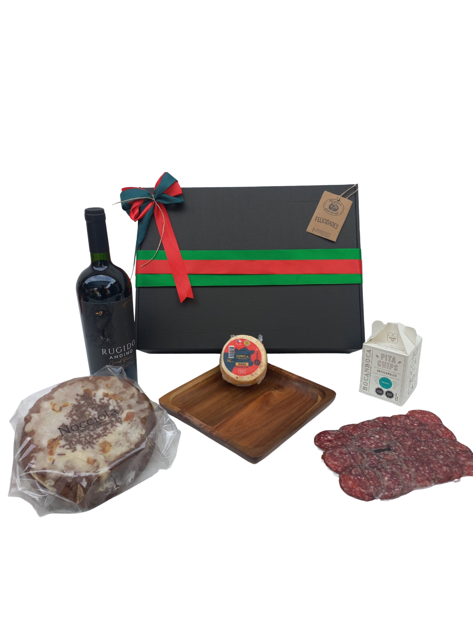 Eleve la experiencia navideña de sus colaboradores con esta versión premium que combina lo mejor de la gastronomía artesanal. Vino Gran Reserva chileno, salame ahumado Angus, queso gourmet y el tradicional pan de pascua, todo presentado con un elegante plato de madera para servir con distinción.